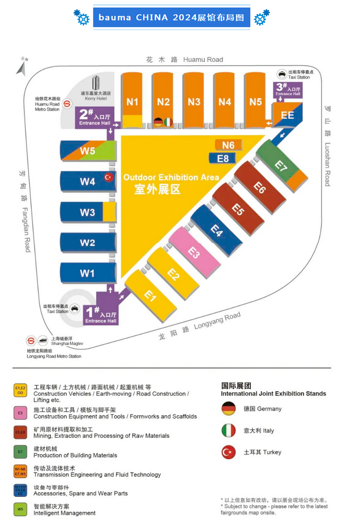 為此,本屆展會特別新增規劃了智能解決方案(淺綠色)和新能源技術兩個全新主題,旨在聚焦引領工程機械行業的數智化轉型與綠色可持續發展。這兩大新設主題不僅成功吸引了眾多在工程機械領域嶄露頭角的“新入局者”加入,包括ABB、BYD-弗迪電池、華測導航、深圳匯川、徐州威卡電子、億緯動力、易福門、中電投融和等,同時也將薈萃標桿企業帶來的最新電動化工程機械產品,以及圍繞電池、電機和電控系統的產業鏈解決方案。
